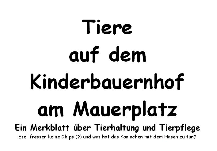 Wir möchten mit dieser Textsammlung dazu beitragen, dass die Tiere auf dem Kinderbauernhof besser verstanden werden. Wir möchten Euer Interesse für die Tiere und die Arbeit auf dem Kinderbauernhof wecken und freuen uns über Anregungen und Mitarbeit.