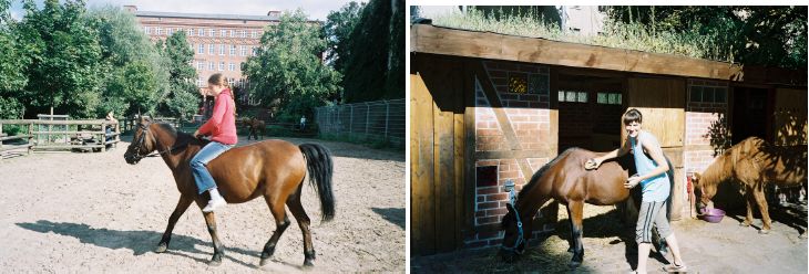 Ihre Körperwärme vermittelt Geborgenheit. Fast alle Kinder wollen gern reiten. Reiten erfordert viel Geschick und Einfühlungsvermögen von den Kindern . Sie lernen mit der Bewegung des Tiers mitzugehen und ihr Gleichgewicht zu halten. Eine Vielzahl von Hilfen sind zu erlernen, um ein Pferd anzutreiben, zu lenken und zum stehen zu bringen. Die Kinder und Jugendlichen lernen, dass sie mit präzisen klaren Zeichen, die sie dem Tier geben, konkrete Reaktionen hervorrufen, ihreBotschaft vermitteln können. Je klarer sie sind, desto eindeutiger kann das Tier sie verstehen.